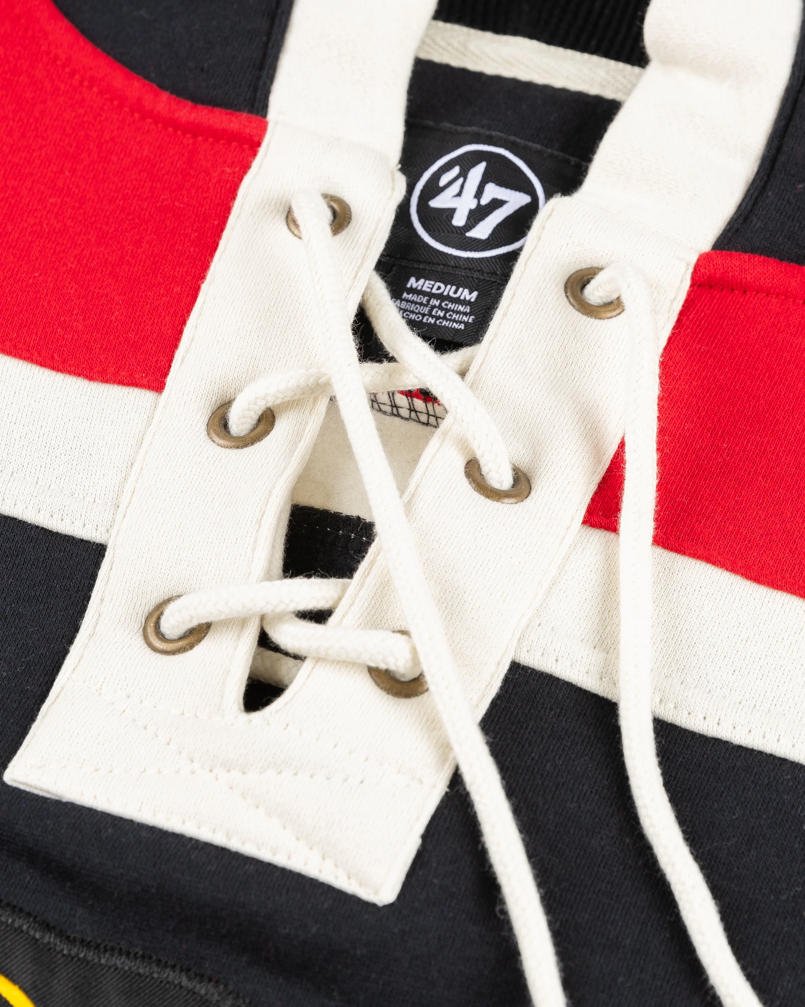 The '47 Superior Lacer Hood is a hockey-inspired silhouette made from midweight fleece with a thermalined hood and twill appliques on the body, shoulders, and sleeves.